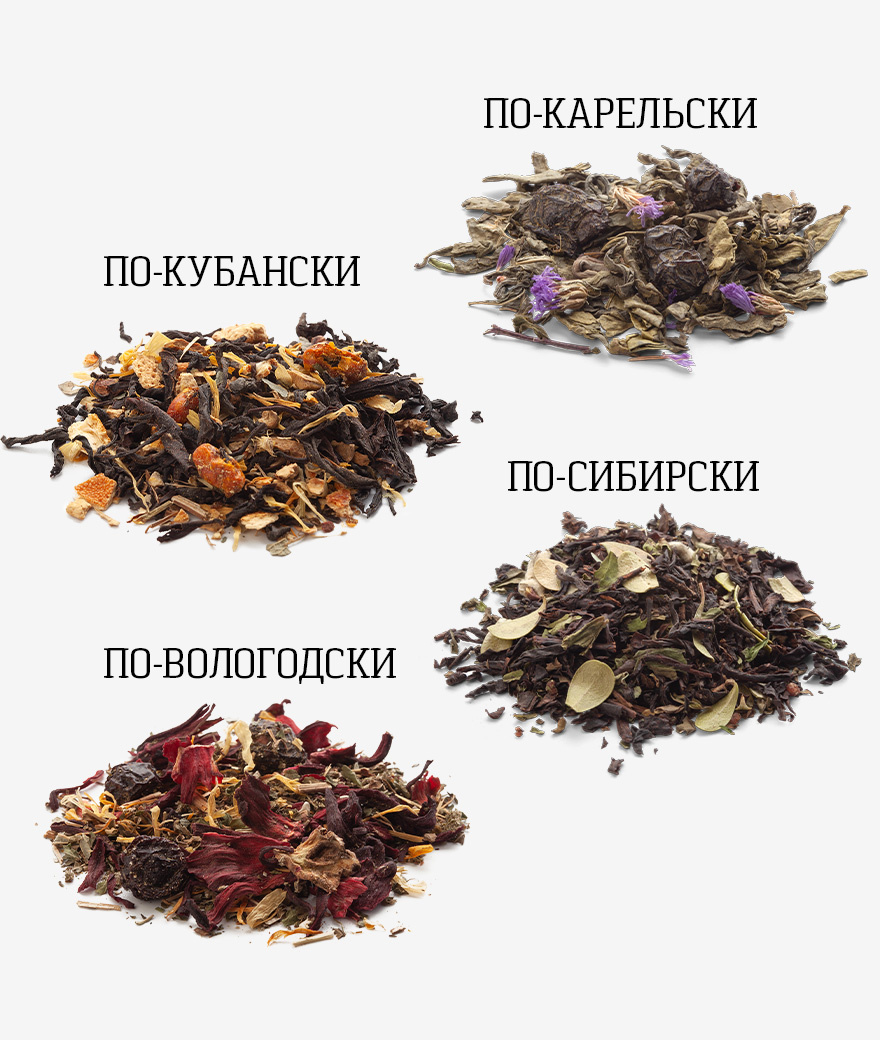 По-кубански: Чай чёрный, лепестки подсолнечника, сублимированные ягоды облепихи, имбирь, лист земляники, цедра апельсина.