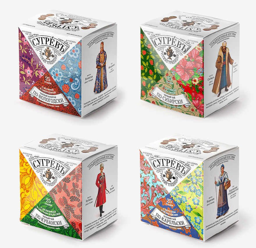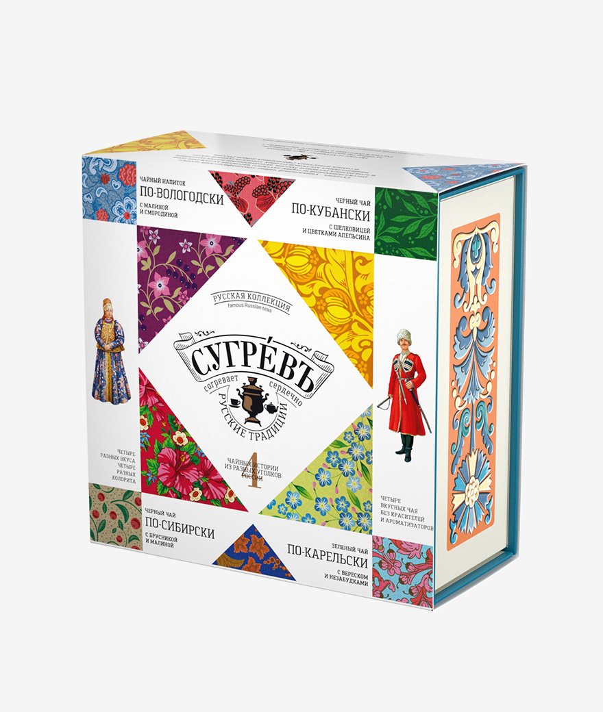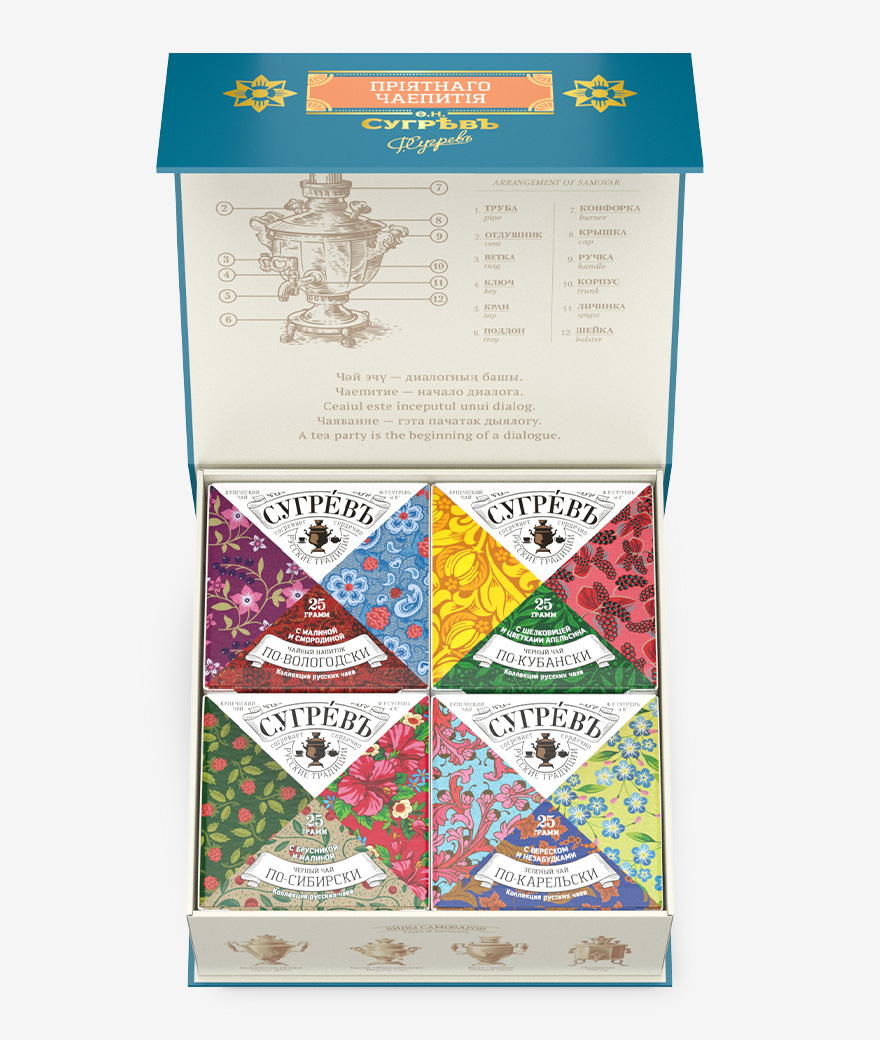 Подарочный набор из четырёх эксклюзивных купажей листового чая, трав и ягод, характерных для разных регионов России, в сувенирной шкатулке из переплётного картона с магнитным клапаном. Содержит подробную схему устройства русского самовара на русском и английском языках.