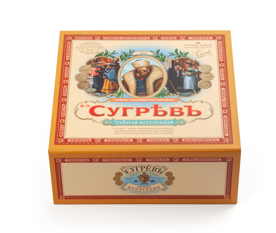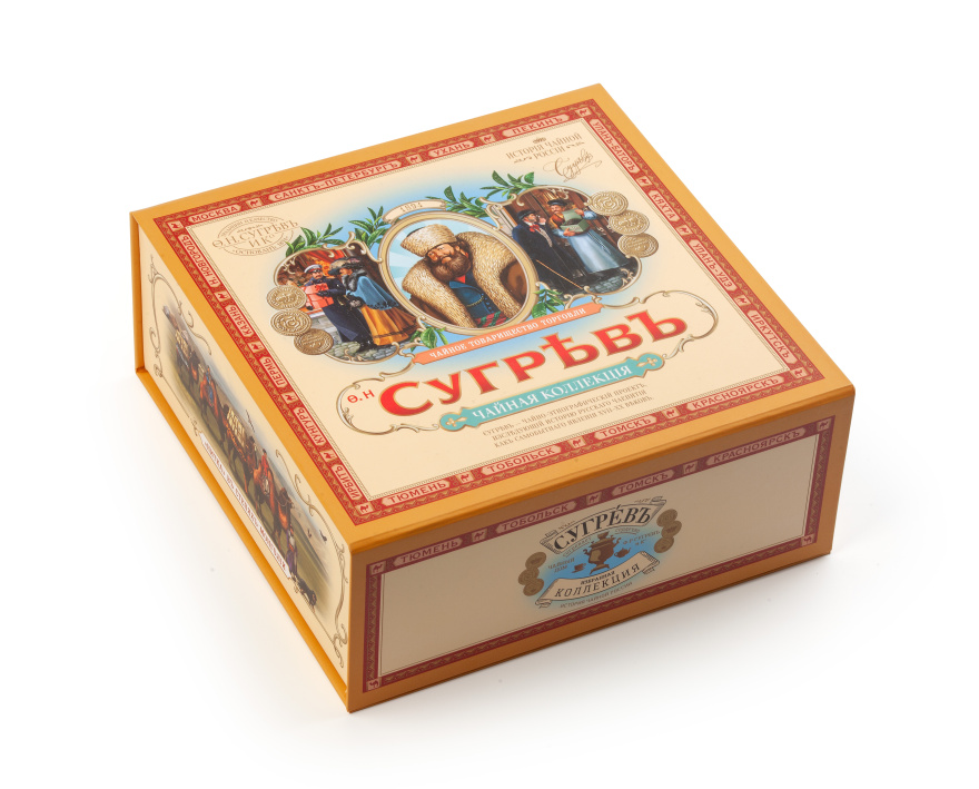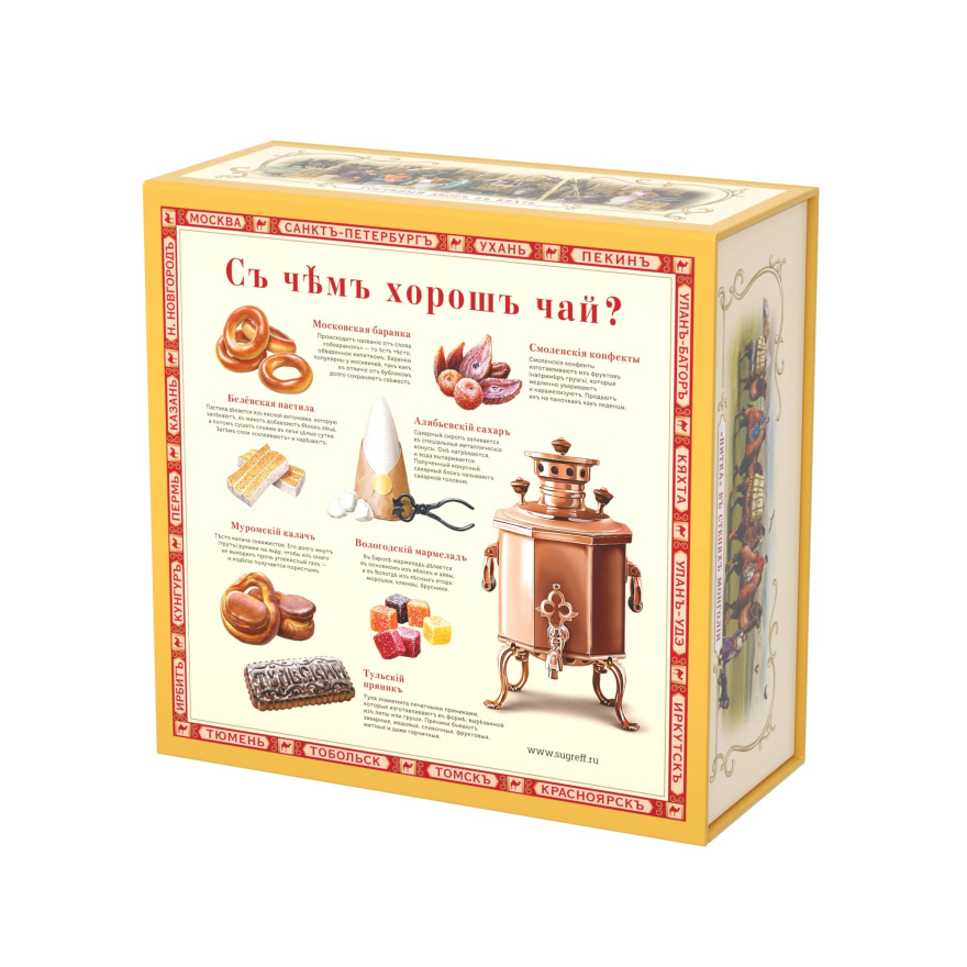 В шкатулке находится 6 упаковок чая с 15 саше внутри и 2 вида леденцов со вкусом малины и смородины.