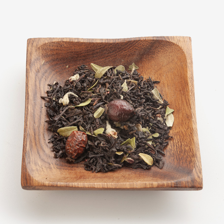 Чай по-сибирски: цветы яблони, чай чёрный, плоды шиповника, мята, лист брусники, кусочки сублимированной малины .