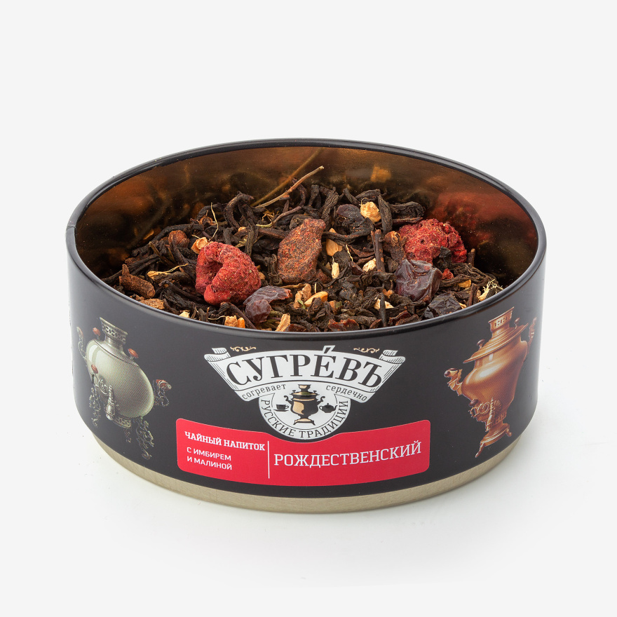 Чайный напиток:  шиповник, гвоздика, байховый индийский чай черный ассам,  имбирь, малина, клюква, мята.