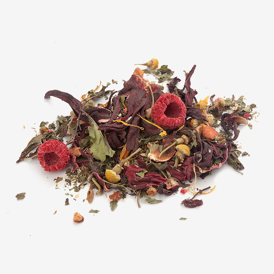 Каркаде (пол цветка), рябина черноплодная, мята, лист малины, лист земляники, календула, вишня сушеная.