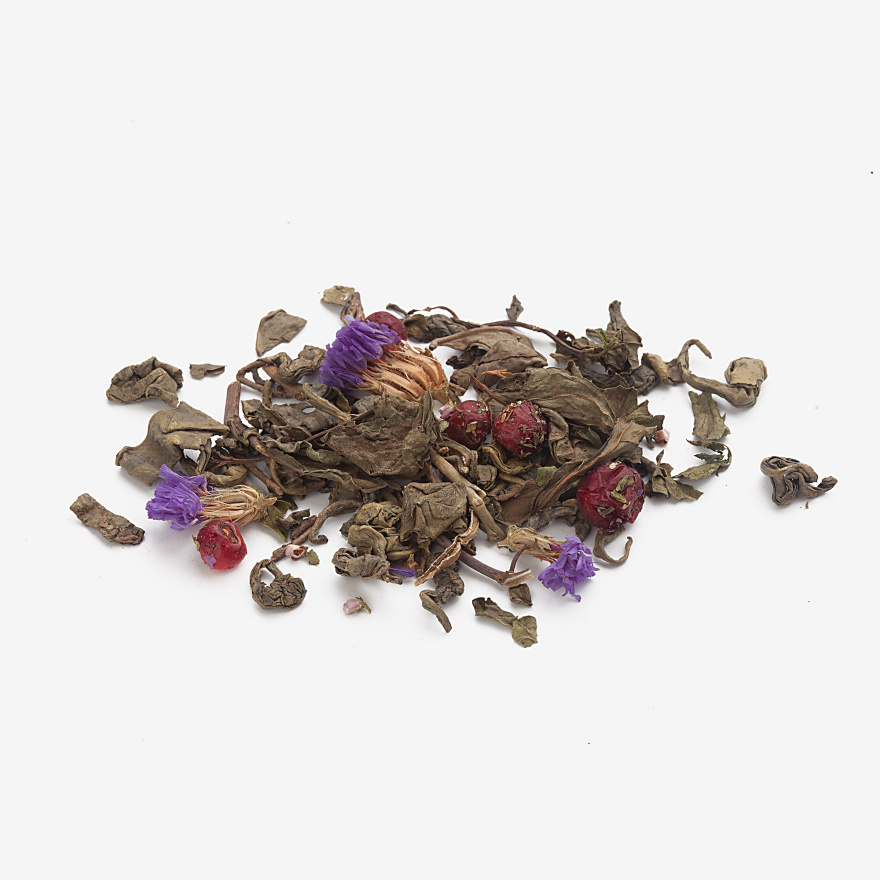 Чай зеленый, незабудка, рябина черноплодная, вереск, вишня сушеная, мята.