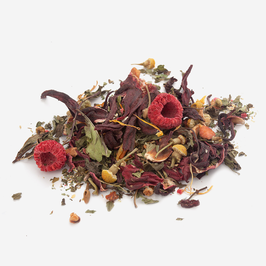 Каркаде (пол цветка), рябина черноплодная, мята, лист малины, лист земляники, календула, вишня сушеная, натуральный ароматизатор.