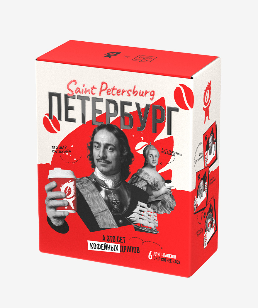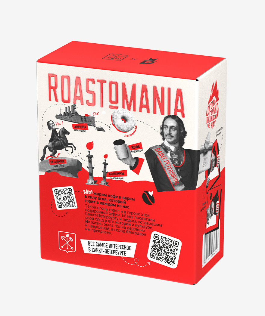Важно! На коробке размещены 2 QR-кода: один ведёт на сайт производителя, то есть, ROASTOMANIA, а другой – на сайт, знакомящий с достопримечательностями Петербурга, таким образом, коробка является своеобразным путеводителем по культурной столице.