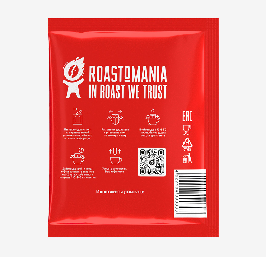 Каждый пакет заполняется азотом, уровень кислорода в нём не должен превышать 1%, тогда кофе сохранит всю свою свежесть, вкус и аромат не менее полугода. Кофе обжарен в Нижнем Новгороде, в цехе обжарки ROASTOMANIA, на ростере Loring (США), а упакован нашими партнёрами в Ижевске – именно там созданы одни из лучших в мире условия для фасовки: дрип-станция Fuso (Япония), кофемолка Ditting 1403 Industrial (Швейцария), азотная станция Oxymat N190 (Дания).