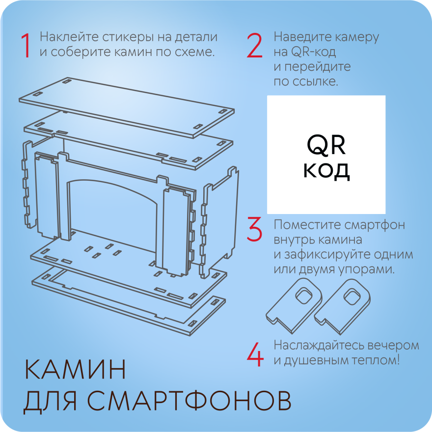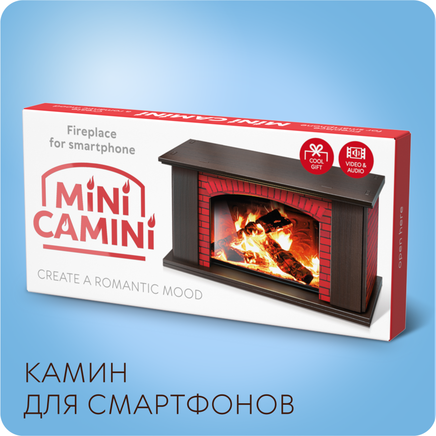 При наведении на QR-код на упаковке, в смартфон подгружается видео с горящим камином. Вы видите завораживающее пламя и слышите умиротворяющее потрескивание дров. Смартфон фиксируется в мини камине, а затем ставится на обеденный стол, ночной столик или подоконник.