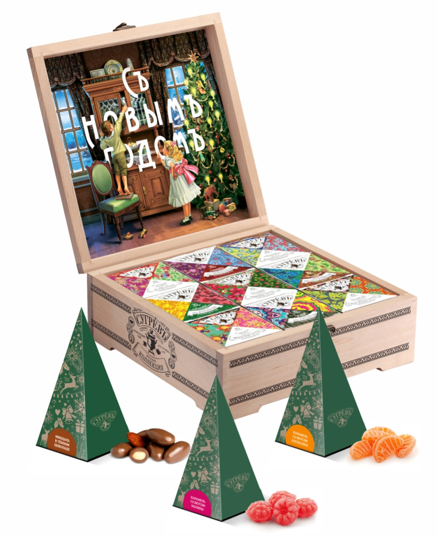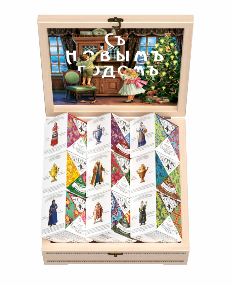 Новогодний подарочный набор из 9 эксклюзивных купажей листового чая, трав и ягод, характерных для разных регионов России, в сувенирной шкатулке из массива дерева. Набор дополнен картонными ёлками с выборочным УФ-лаком с миндалём в шоколадной глазури и леденцами со вкусом малины и апельсина. Под крышкой шкатулки размещена авторская иллюстрация «Канун Рождества».