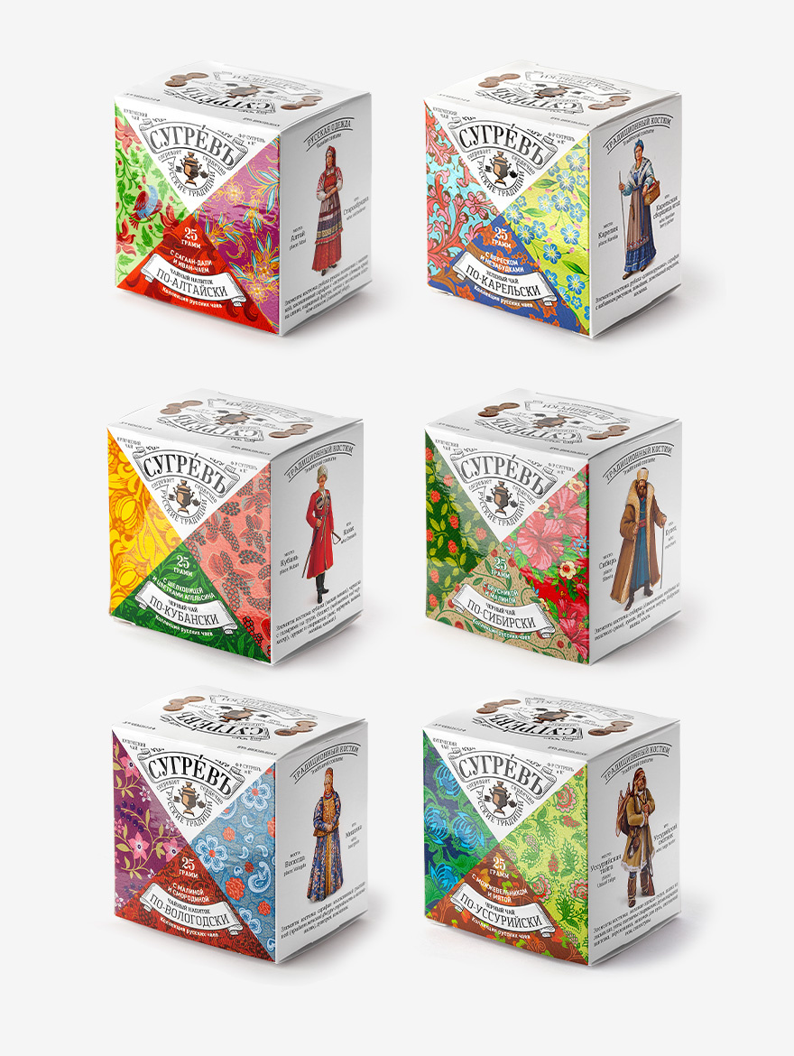 Подарочный набор из шести эксклюзивных купажей листового чая, трав и ягод, характерных для разных регионов России, в стильном саше из ламинированного картона с выборочной лакировкой и ручками из плетёного шнура. На оборотной стороне саше изображены представители различных этнокультурных групп в традиционных костюмах с подписями на английском и русском языках.