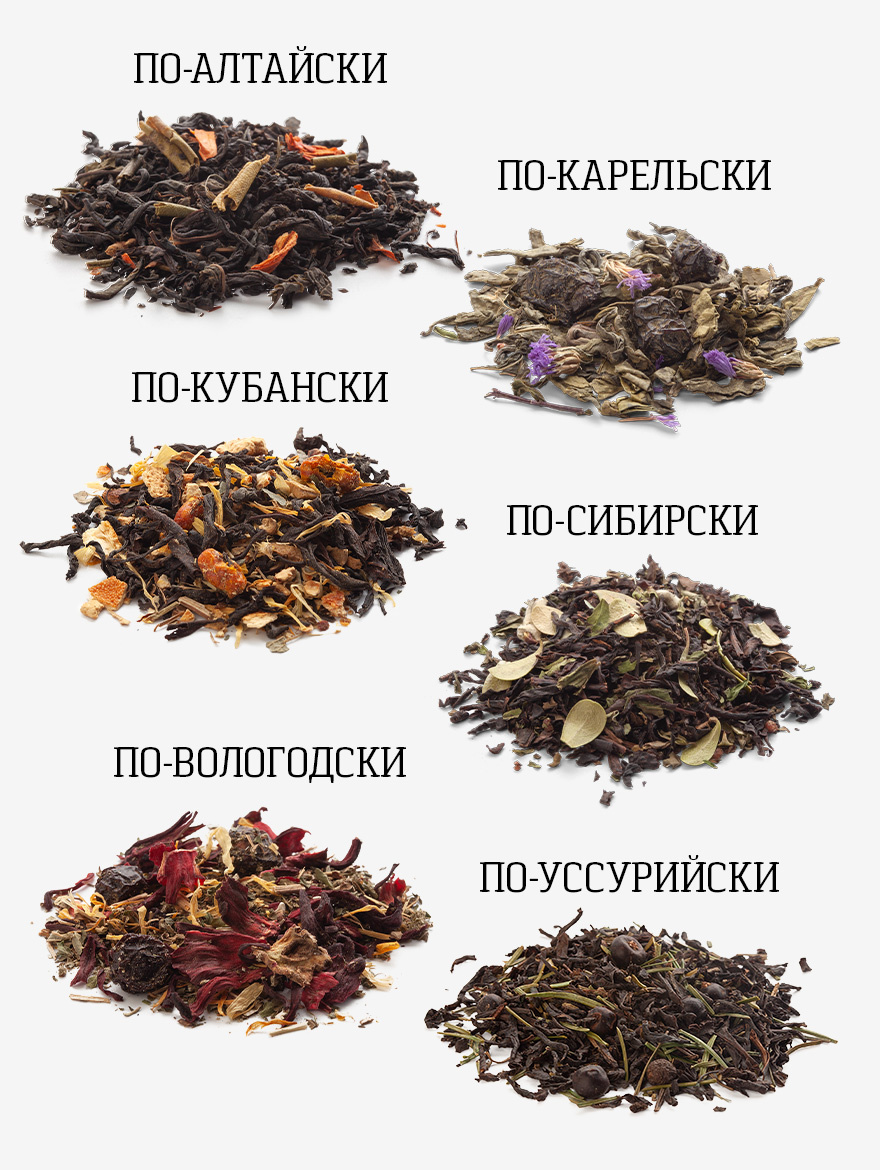 Подарочный набор из шести эксклюзивных купажей листового чая, трав и ягод, характерных для разных регионов России, в стильном саше из ламинированного картона с выборочной лакировкой и ручками из плетёного шнура. На оборотной стороне саше изображены представители различных этнокультурных групп в традиционных костюмах с подписями на английском и русском языках.