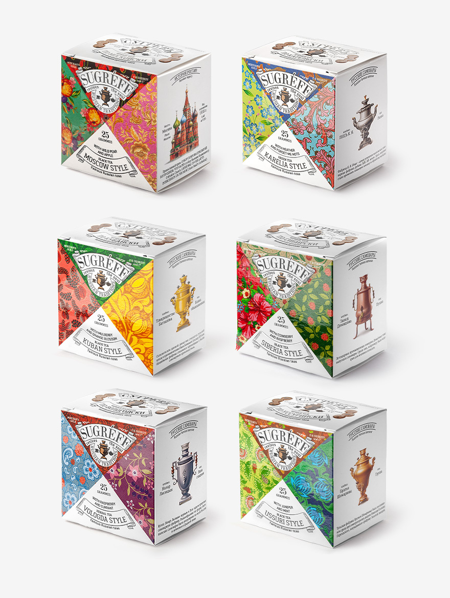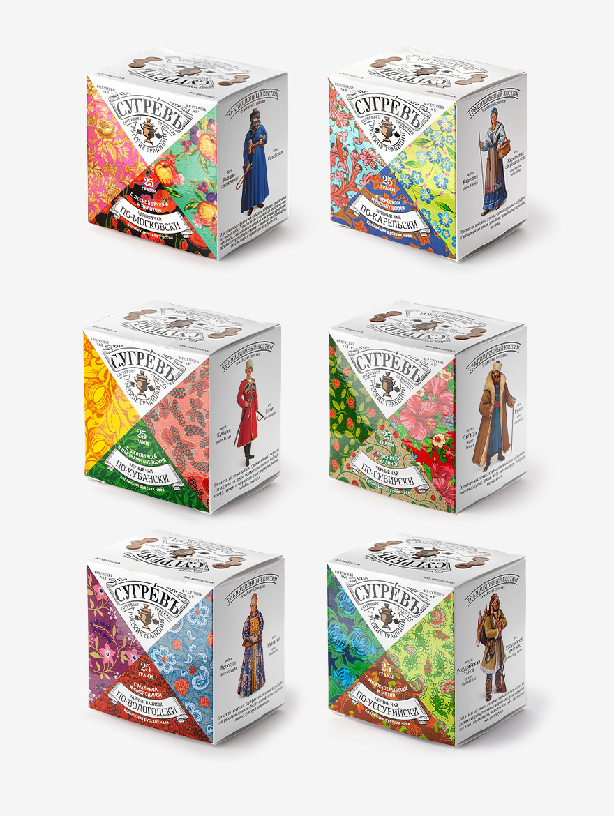 Внутри — ассорти из шести чаев: от насыщенных чёрных с ягодами до деликатных зелёных с лепестками и травами. Каждая смесь — это отдельное маленькое путешествие по регионам России: по‑Московски, по‑Карельски, по‑Кубански, по‑Сибирски, по‑Вологодски, по‑Уссурийски