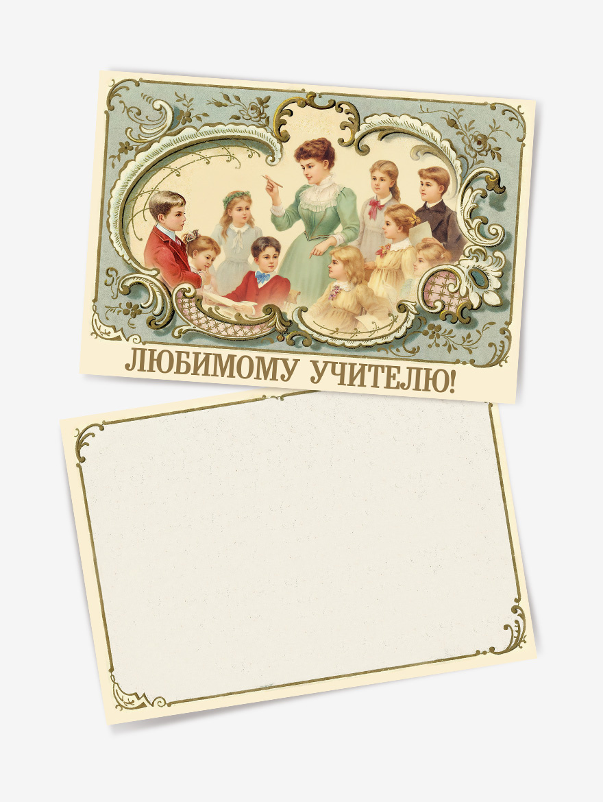 Плотный дизайнерский пакет с шнуровыми ручками украшен серией исторических персонажей — образов учителей и учеников. Иллюстрации выполнены в светлой, музейной палитре: они не перегружают, а создают атмосферу уважения к профессии. В комплекте — открытка «Любимому учителю»: пару строк от руки превращают подарок в личную историю.