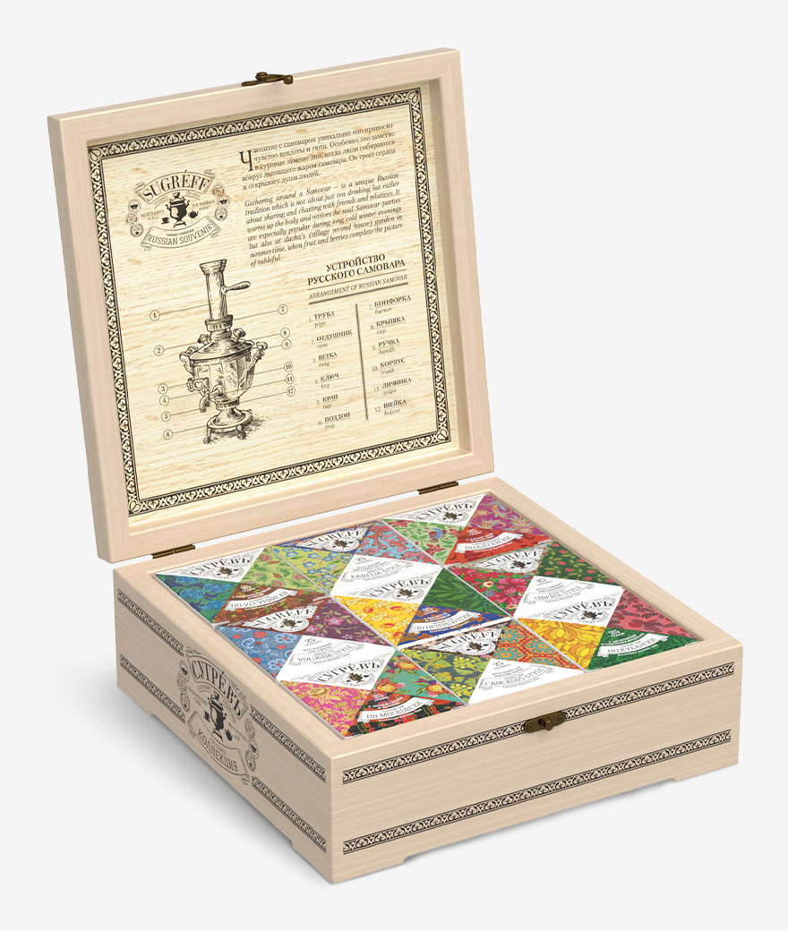 Представляем вашему вниманию уникальный чай «Сугрев» в эксклюзивной деревянной шкатулке, оформленной в виде знаменитого Храма Спас на Крови. Этот набор включает девять оригинальных купажей, в центре которых чай По-питерски, каждый купаж обладает своим неповторимым вкусом и ароматом. Чай из данной коллекции станет отличным подарком для ценителей настоящего чая и тем, кто ищет оригинальные решения для своего чаепития.