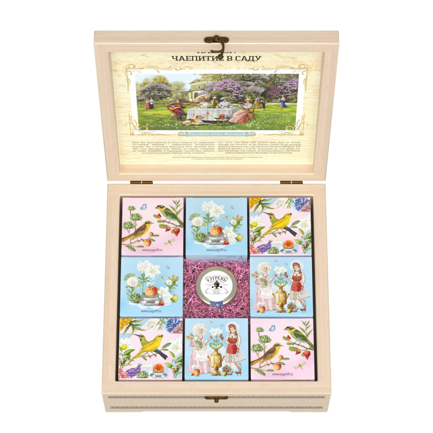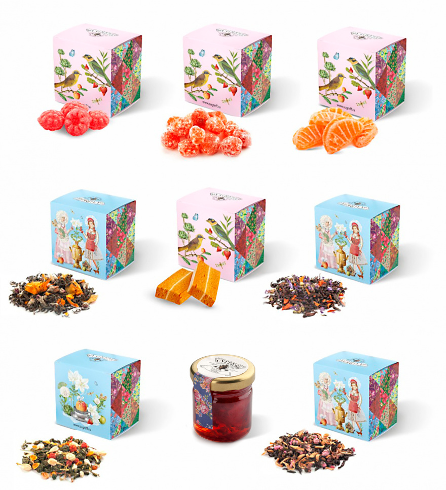 Купажи цветочных чаев составлены так, чтобы сочетать вкус и аромат отборных сортов китайского и индийского чай с красотой разноцветных лепестков календулы, мальвы, цветов яблони, персика, жасмина, апельсина, акации. Ягодно-фруктовые десерты гармонично дополняют набор.