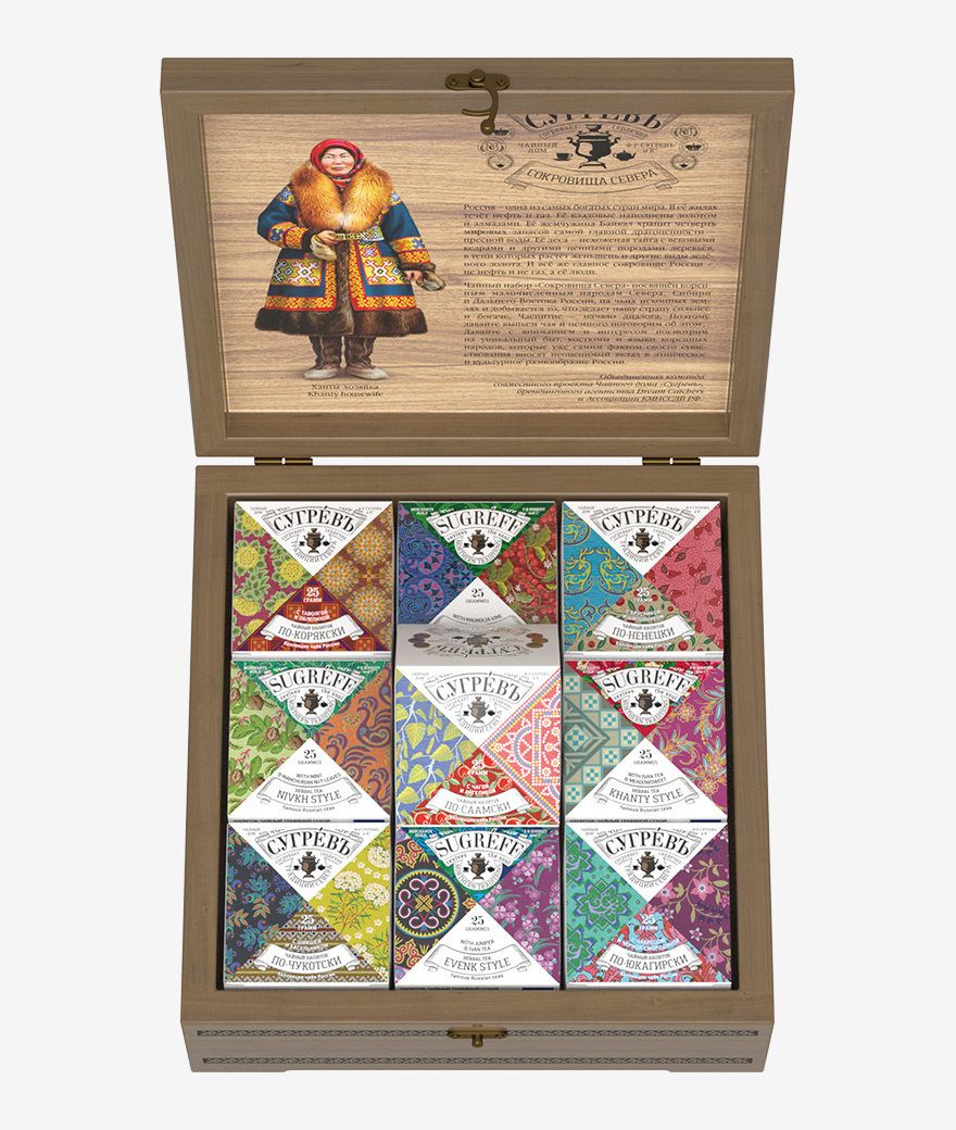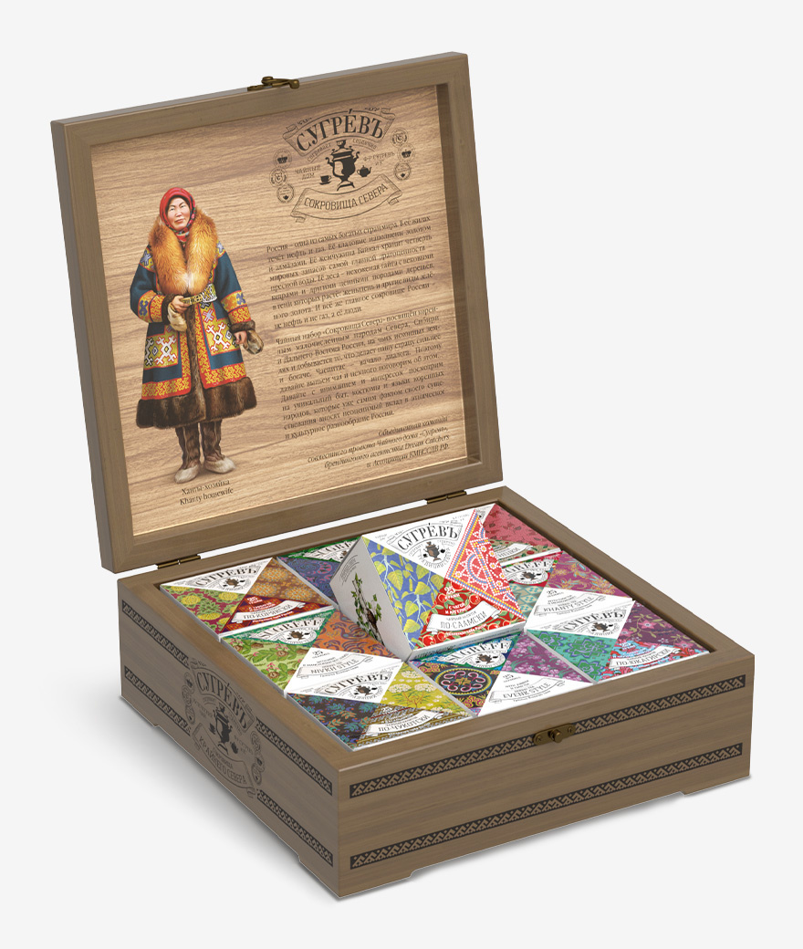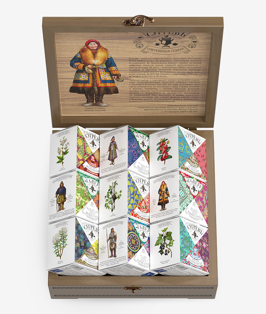 Чайный набор «Сокровища Севера» посвящён коренным малочисленным народам Севера, Сибири и Дальнего Востока России, на чьих исконных землях и добывается то, что делает нашу страну сильнее и богаче. Чаепитие – начало диалога. Поэтому давайте выпьем чая и немного поговорим об этом!