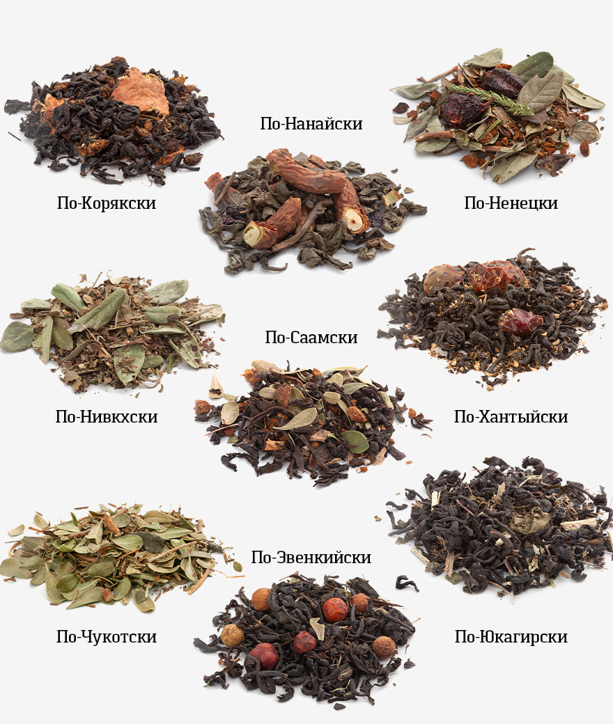 Чайный напиток по-нанайски: лоза и ягоды лимонника дальневосточного, чай зелёный.                                                                   Чайный напиток по-нивхски: лист ореха маньчжурского, мята, лист брусники, лист чёрной смородины.