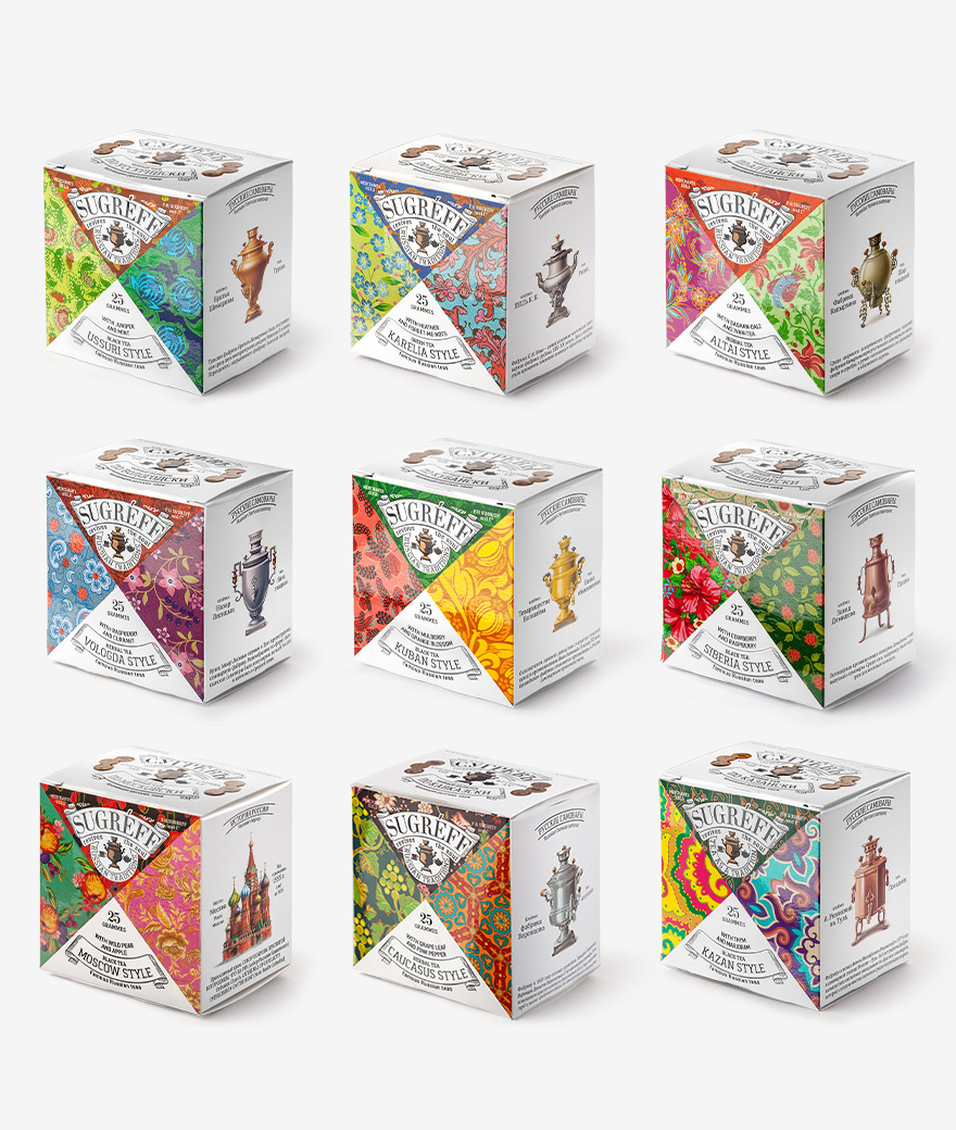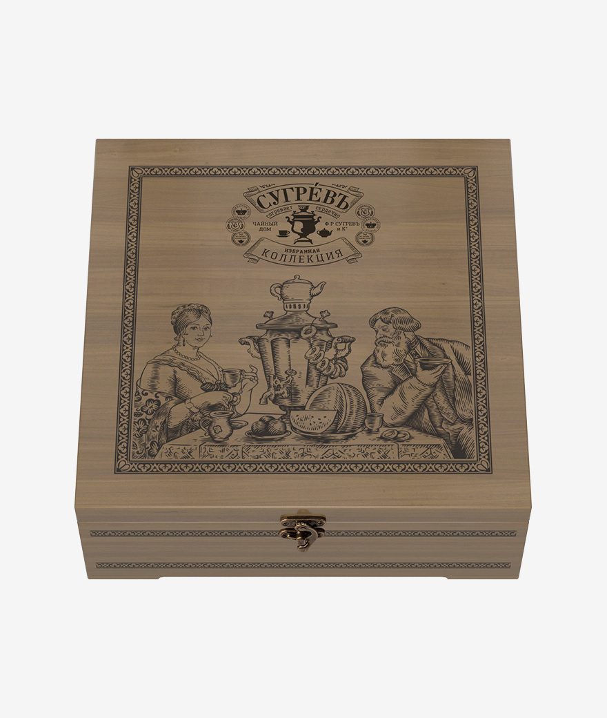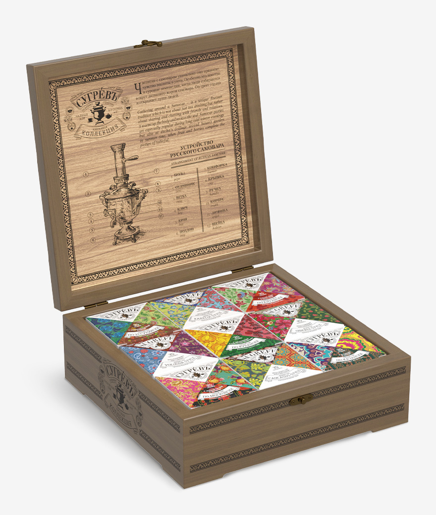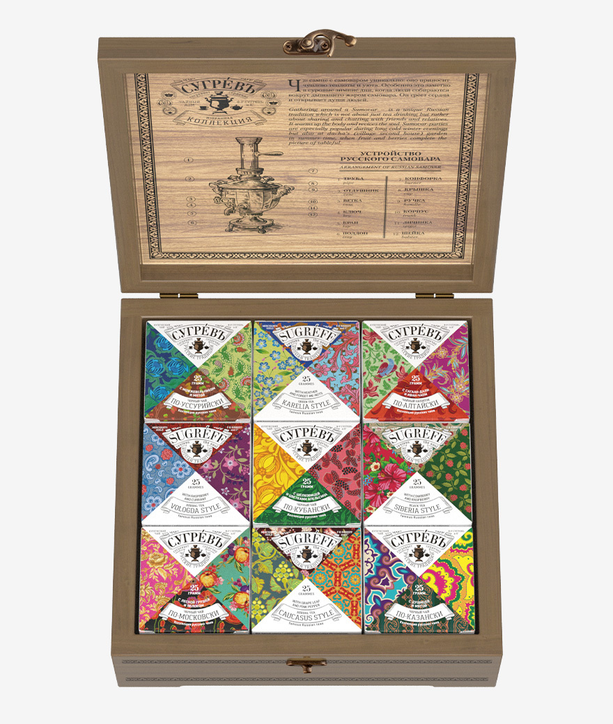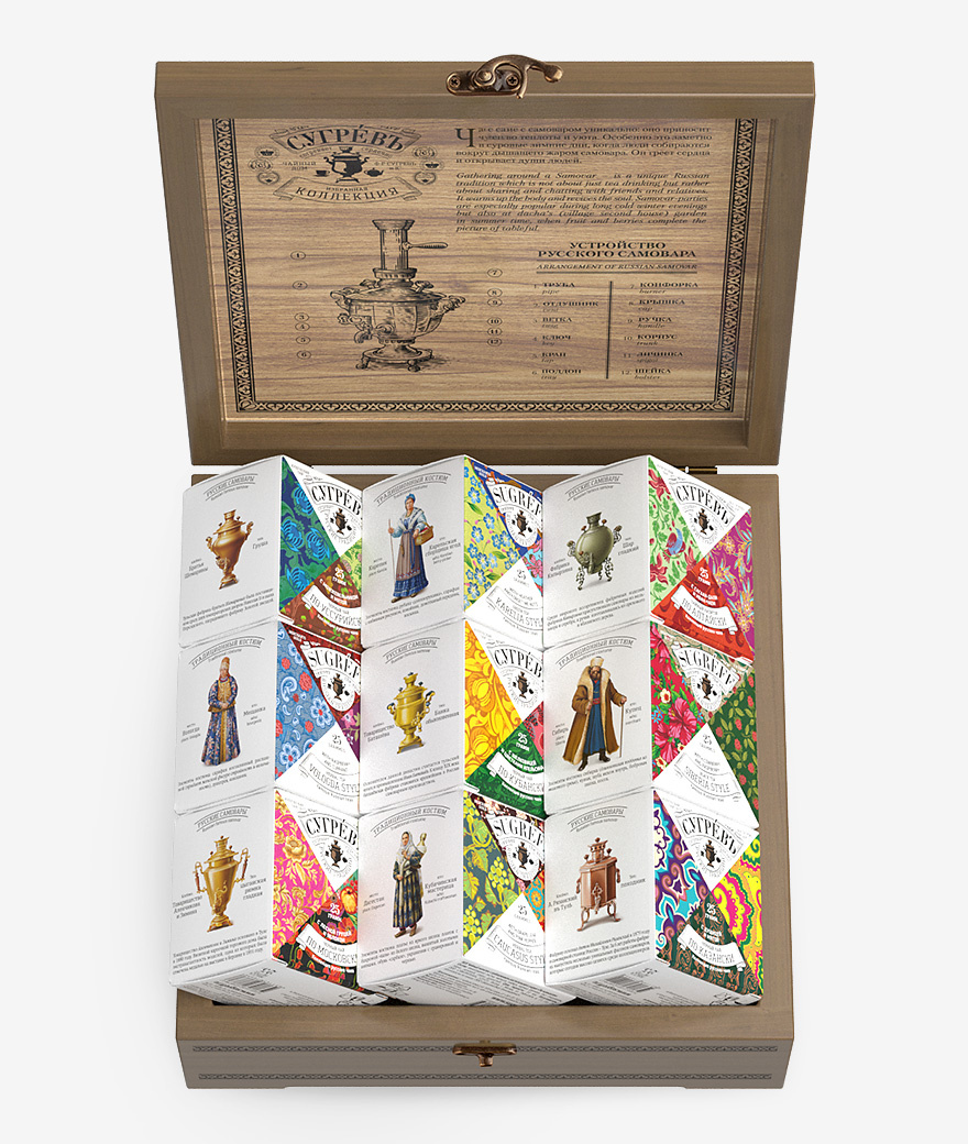 Подарочный набор из девяти эксклюзивных купажей листового чая, трав и ягод, характерных для разных регионов России, в сувенирной лакированной шкатулке из массива берёзы. Содержит подробную схему устройства русского самовара на русском и английском языках.