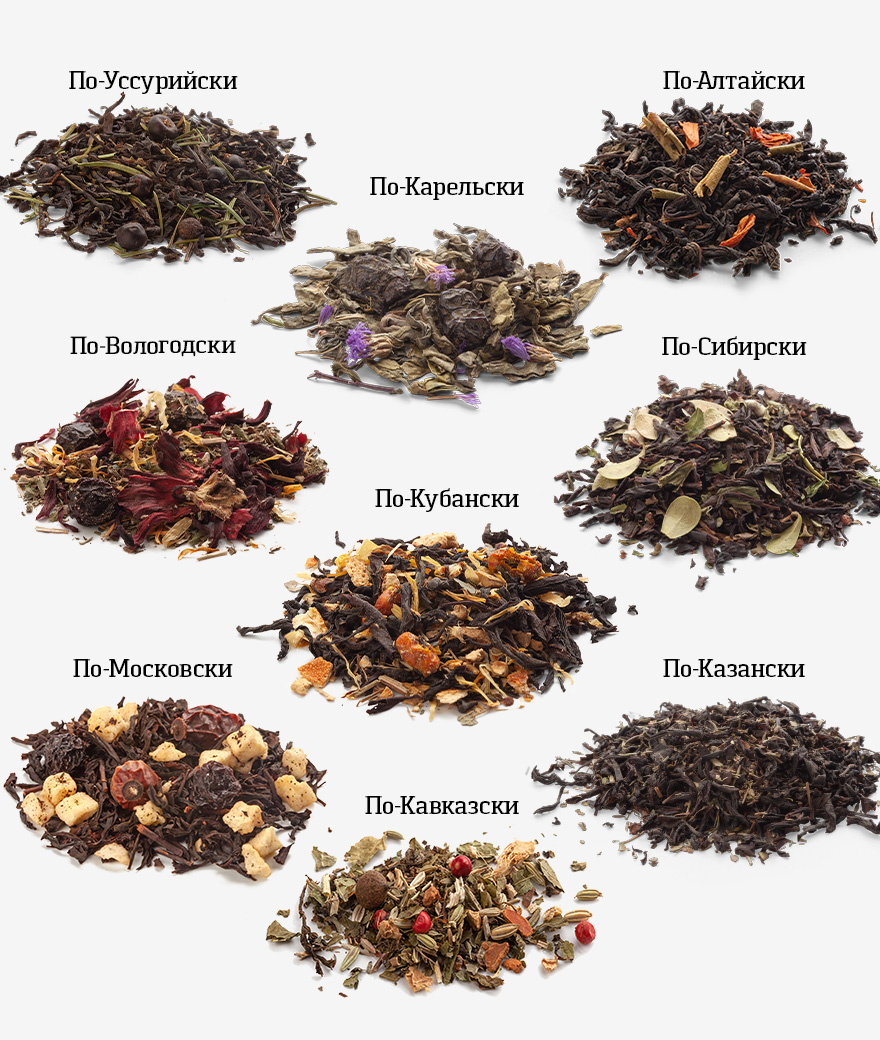 По-уссурийски: чай чёрный байховый, ягоды можжевельника, мята, рябина черноплодная, клюква.