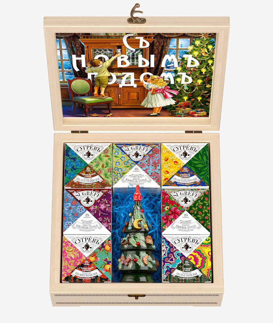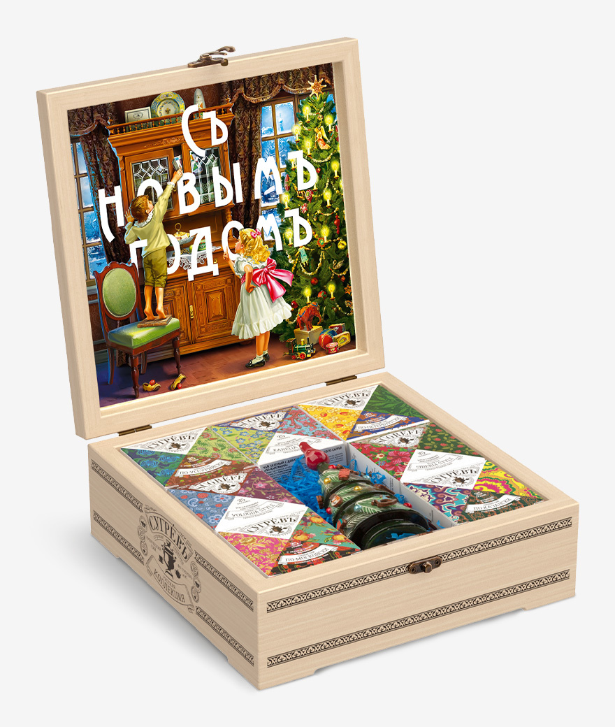 Подарочный набор из 7 эксклюзивных купажей листового чая, трав и ягод, характерных для разных регионов России, в сувенирной шкатулке из массива берёзы.