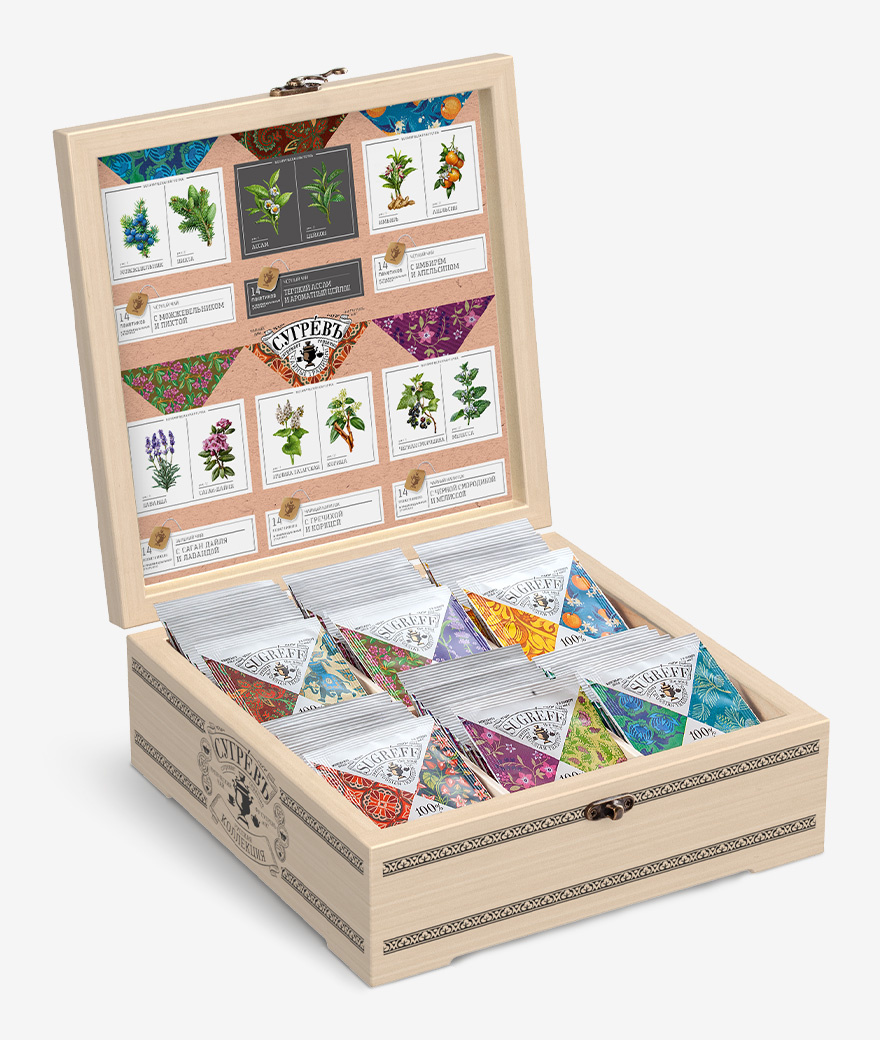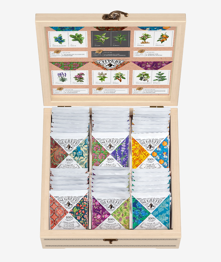 Набор представляет собой коллекцию из 6-и оригинальных купажей чая и чайных напитков в индивидуальных саше. В отличие от обычных пакетированных чаёв, наша продукция 100% натуральная. Яркие ароматы создаются благодаря естественному букету таких растений, как имбирь, апельсин, лаванда, пихта, можжевельник, чёрная смородина, мелисса и саган дайля.