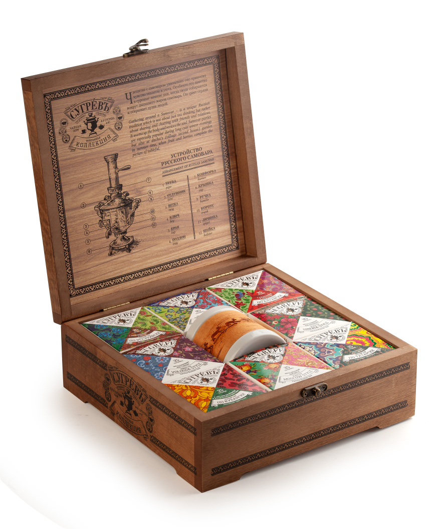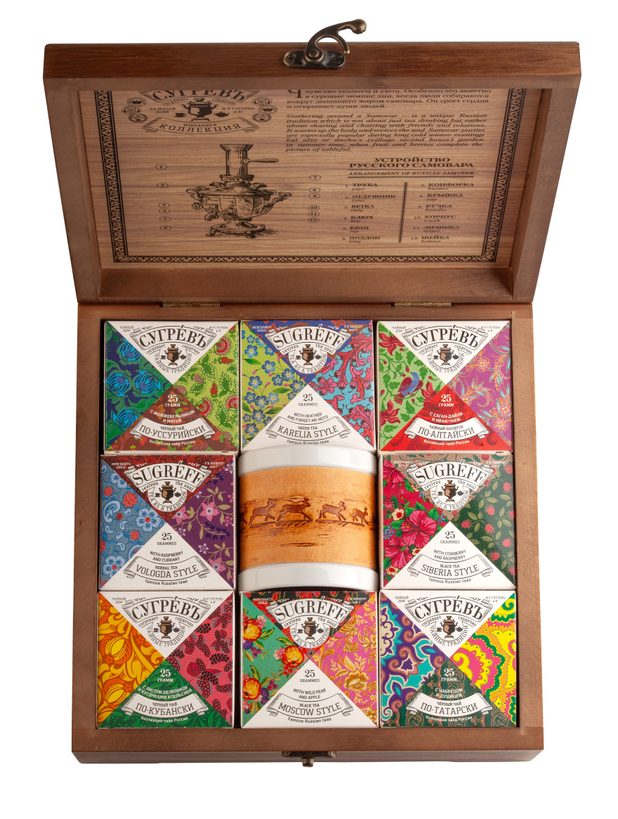 Подарочный набор из восьми эксклюзивных купажей листового чая c травами и ягодами характерными для разных регионов России, в сувенирной шкатулке из массива берёзы. Содержит подробную схему устройства русского самовара на русском и английском языках.
