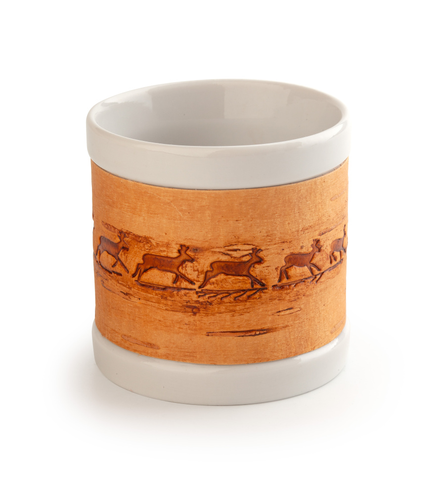 Необычная кружка из фарфора с берестяным держателем, которая лежит внутри шкатулки, является логичным завершением подарка и подчеркивает его самобытность, и уникальность.