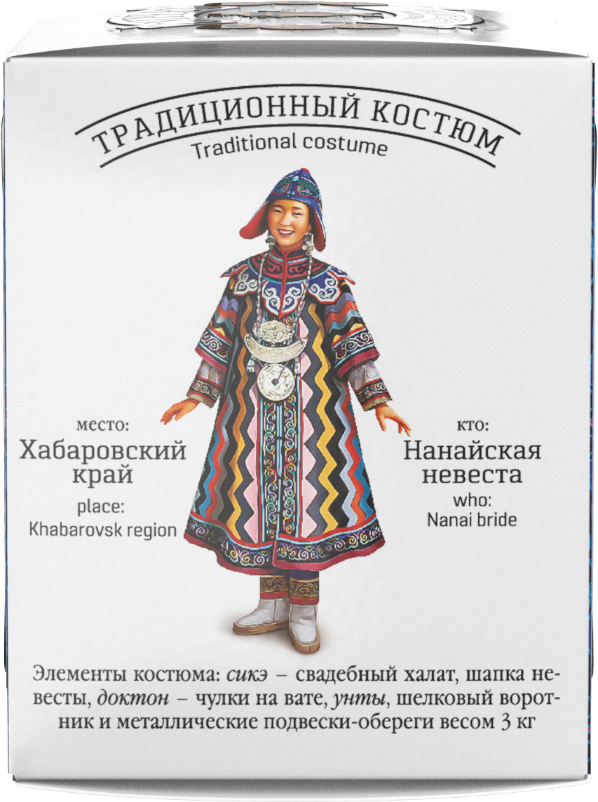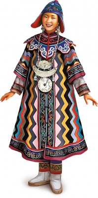 Элементы костюма: свадебный халат сикэ, шапка невесты, чулки на вате доктон, унты, шелковый воротник и металлические подвески-обереги весом 3 кг