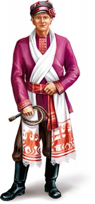 Плетеный пояс с кистями на концах; кожаные сапоги. Фуражка из черного сукна, украшенная цветной лентой и розеткой и бантами из лоскутов. Кожаные сапоги.