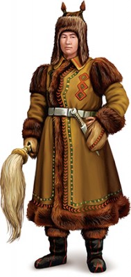 Кафтан с поясом, кожаные штаны и меховые носки, сапоги из оленьей кожи и меха. Цветок лилии-санданы — главный орнамент якутской одежды.